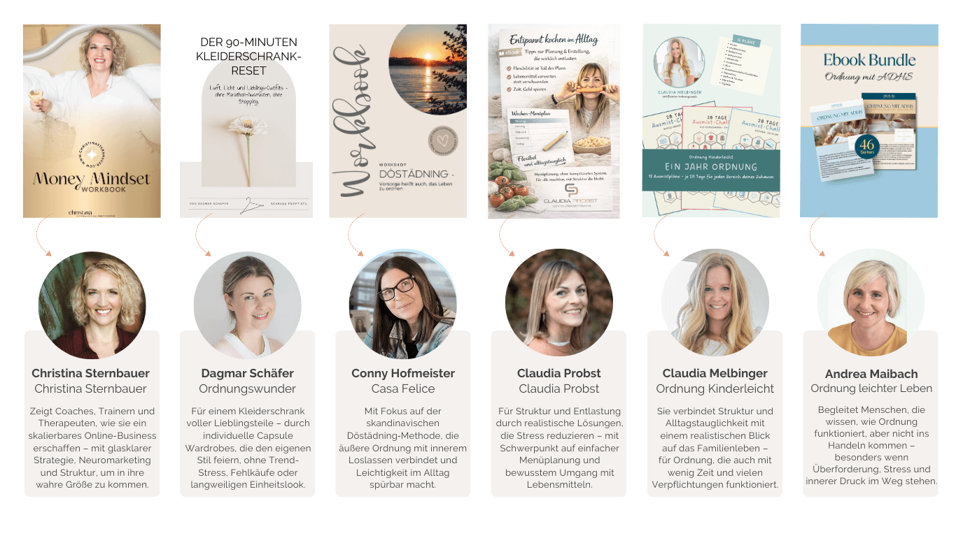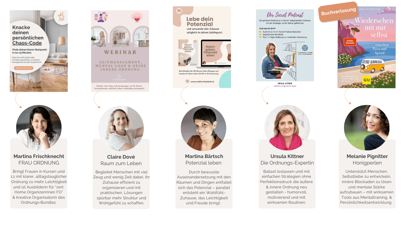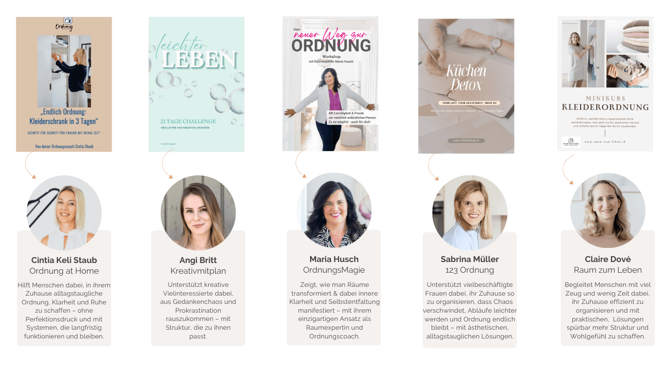 Deshalb habe ich die besten Expertinnen für Ordnung - im innen wie aussen, aus dem DACH-Raum zusammengebracht und alle teilen ihr Wissen, ihre Erfahrung, ihre Geheimnisse...